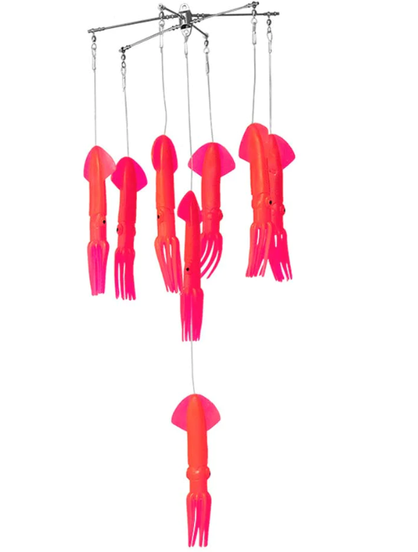 The Buku Dredge Teaser is a pre-made dredge teaser that consists of 8 x 9″ soft squid attached to it, one on each of the six arms and two coming off the centre position.