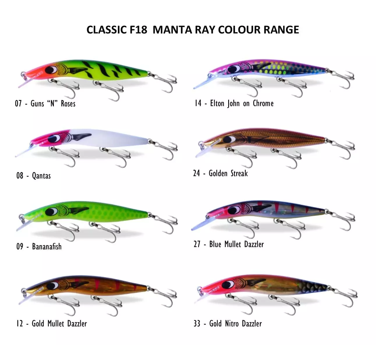 The Classic F18 Manta Ray features a specially designed, deep diving bib that makes this lure crash dive to over 18 feet. Ideal for all deep trolling work when chasing Barra, Threadfin, Jacks, Trevally, Cod, Fingermark, Reef Fish, Flathead, Kingfish, Bonito and more.