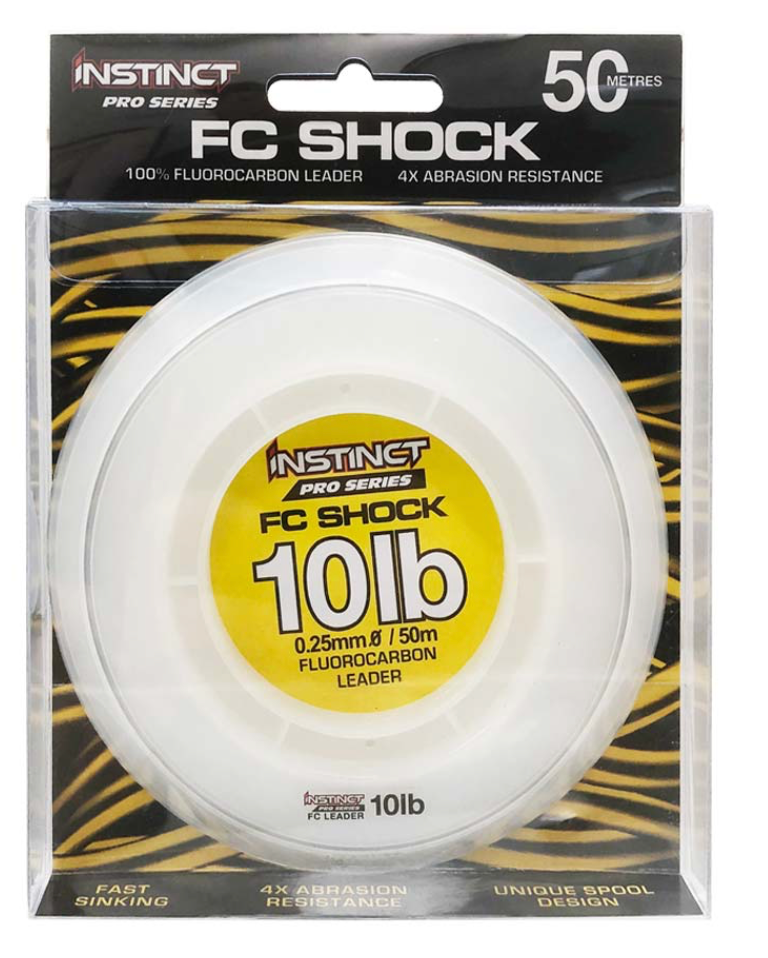 With improved stretch capacity, the Instinct Pro Series FC Shock Fluorocarbon Leader is designed to prevent the line breaking when a fish strikes hard, yet still retain 4X abrasion resistance for security around structure and reefs. As an 100% fluorocarbon leader, it’s basically invisible in the water and has fast sinking properties.