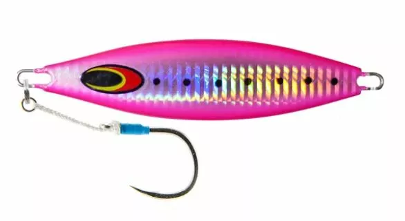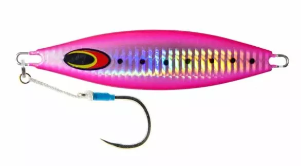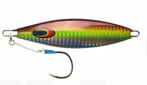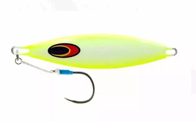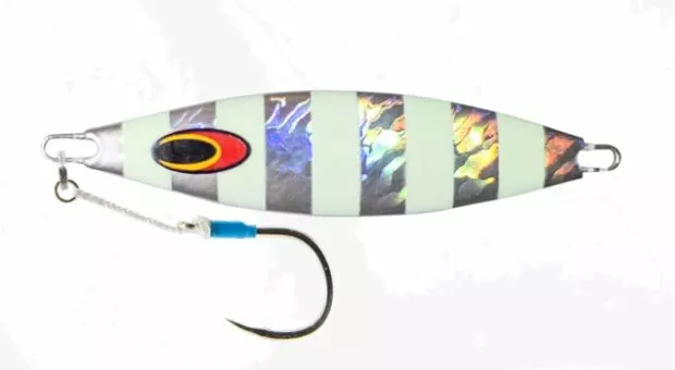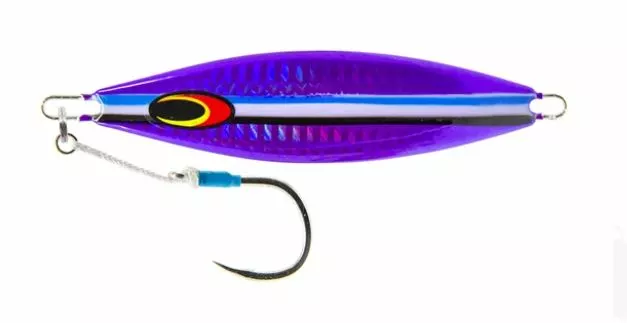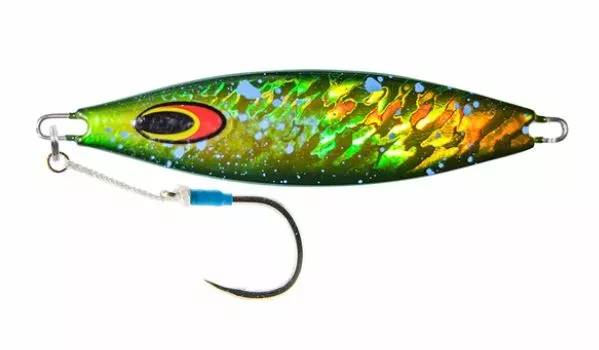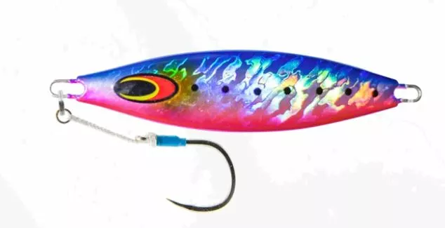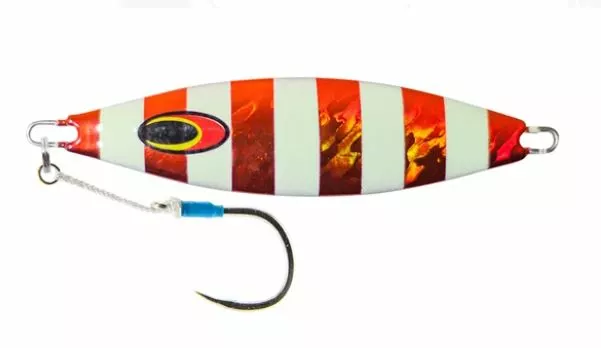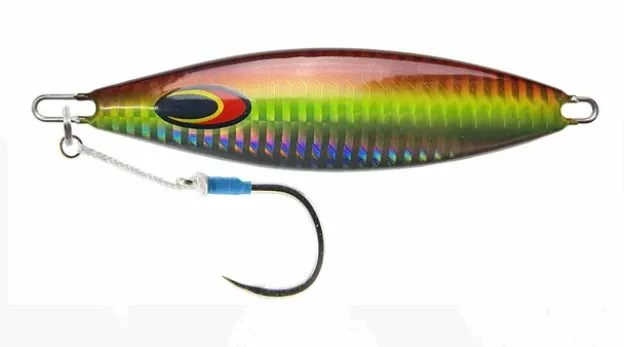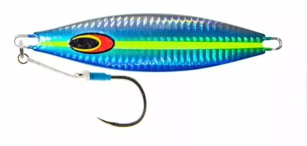 The Buffalo is a Slow Pitch Jig, or often called a flatfall jig. It is centre balanced and will fall with a fluttering action enticing the fish to strike as the lure falls. It is ideal for sinking through schools of tuna haning deep, or using for reef species hanging down deep when worked with long slow flicks of the rod. The Buffalo comes rigged with a super strong and super sharp BKK assist hook rigged on the tail of the jig to assist with the slower fall rate. One of the most effective jig styles imaginable.